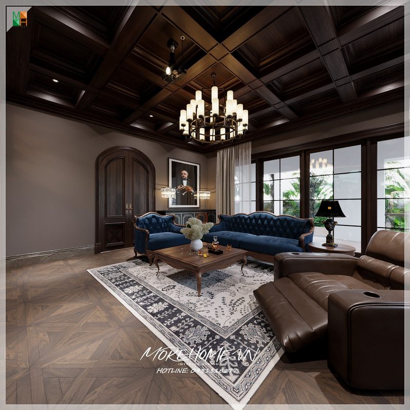 Biệt thự Vinhomes Greenbay Hà Nội có một mẫu sofa gỗ óc chó bọc da đẹp đẳng cấp.