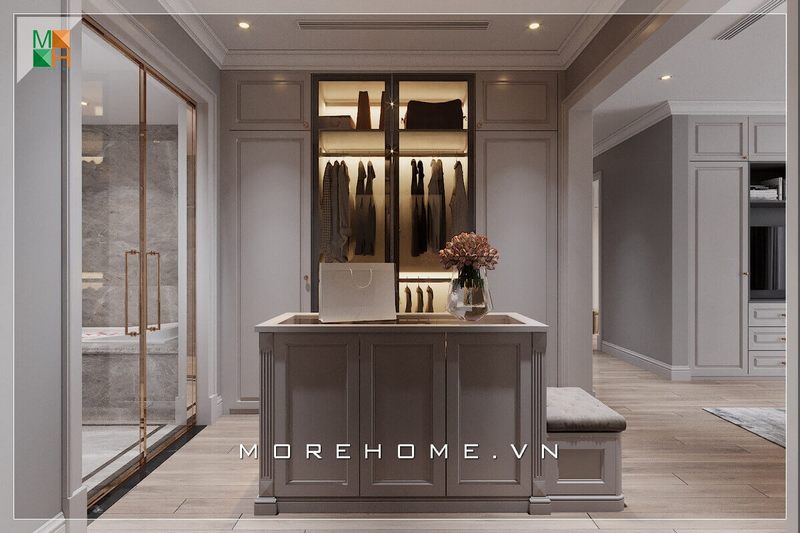 Để làm cho không gian phòng để đồ biệt thự, nhà phố trở nên thuận tiện và đẹp mắt hơn, thiết kế nội thất Morehome đã sáng tạo ra một đảo phụ kiện tân cổ điển đặt giữa căn phòng để tạo ra sự tiện nghi và đẹp mắt.