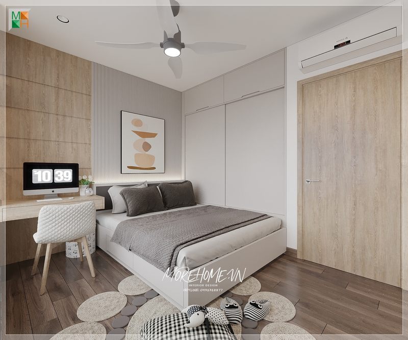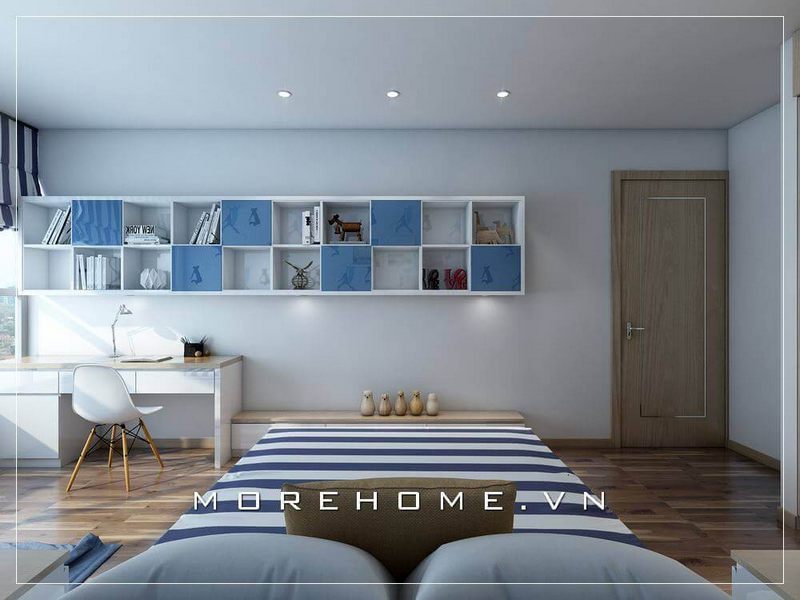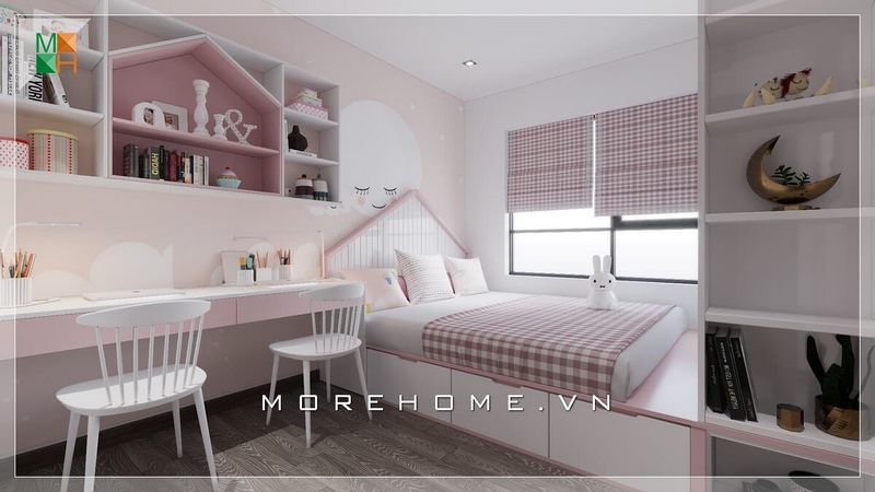 Bàn học gỗ công nghiệp được đặt gần cửa sổ giúp không gian học tập luôn được ánh sáng và thông thoáng.