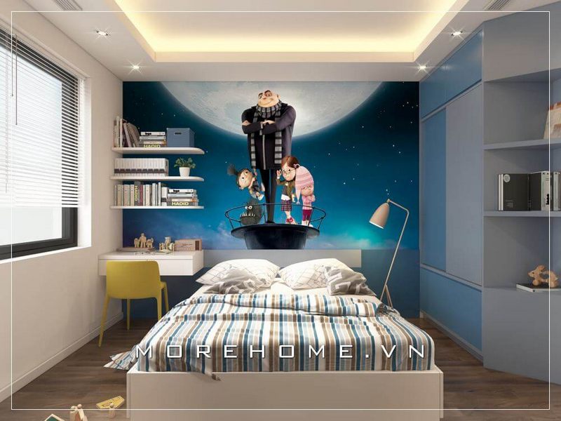 trai Tạo ra một phòng ngủ dành riêng cho con trai bằng cách sử dụng mẫu dán tường 3D người ngoài hành tinh sinh động để tạo ra màu sắc cho phòng ngủ của con trai.