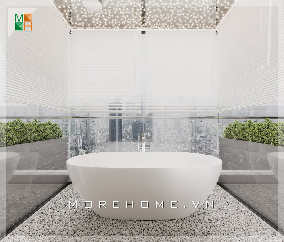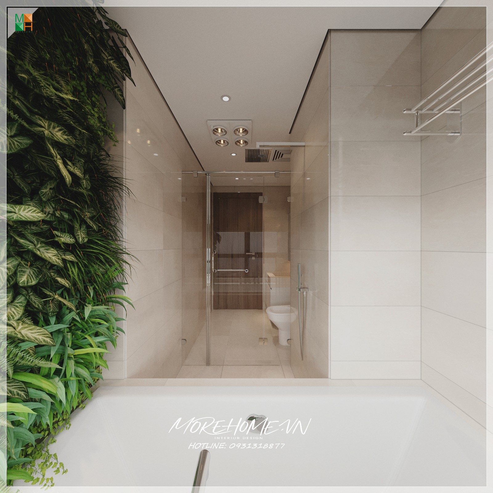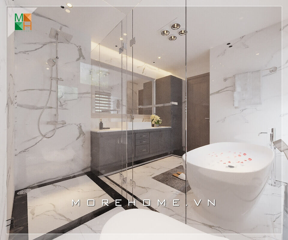Thiết kế phòng tắm được phân chia khu vực rửa mặt, khu vực vệ sinh và khu vực tắm bồn bằng kính cường lực để tránh nước bắn ra xung quanh, giúp cho phòng tắm luôn khô ráo sạch sẽ