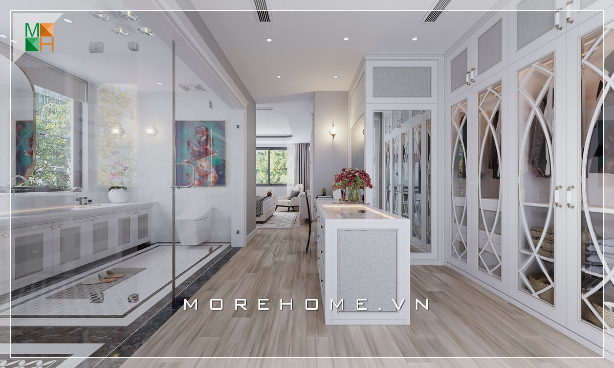 Một góc nhìn tổng quan về không gian phòng thay đồ ngăn cách phòng tắm bằng một vách kính ngăn hiện đại. Đây là sự kết hợp khoa học và tinh tế tăng sự tiện nghi cho không gian nơi đây