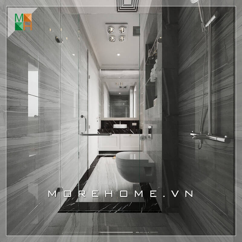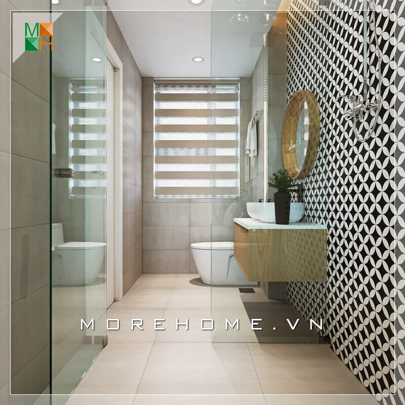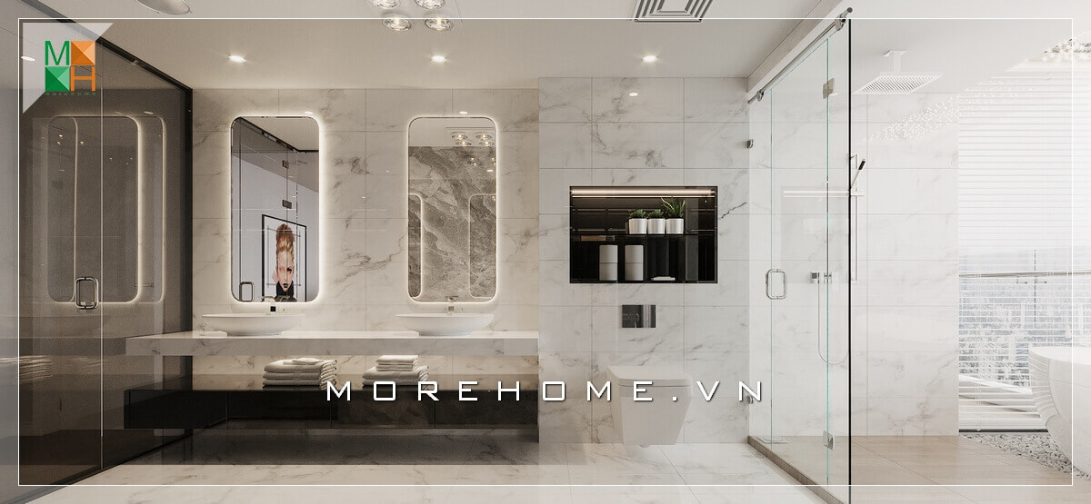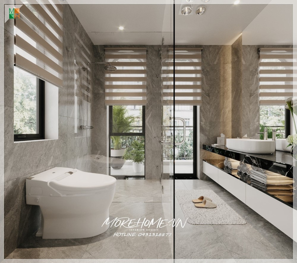 Thiết kế thông minh giữa nhà tắm và nhà vệ sinh liền kề nhưng được ngăn cách bằng kính cường lực trong suốt giúp căn phòng trở nên sang trọng và tiện nghi hơn.